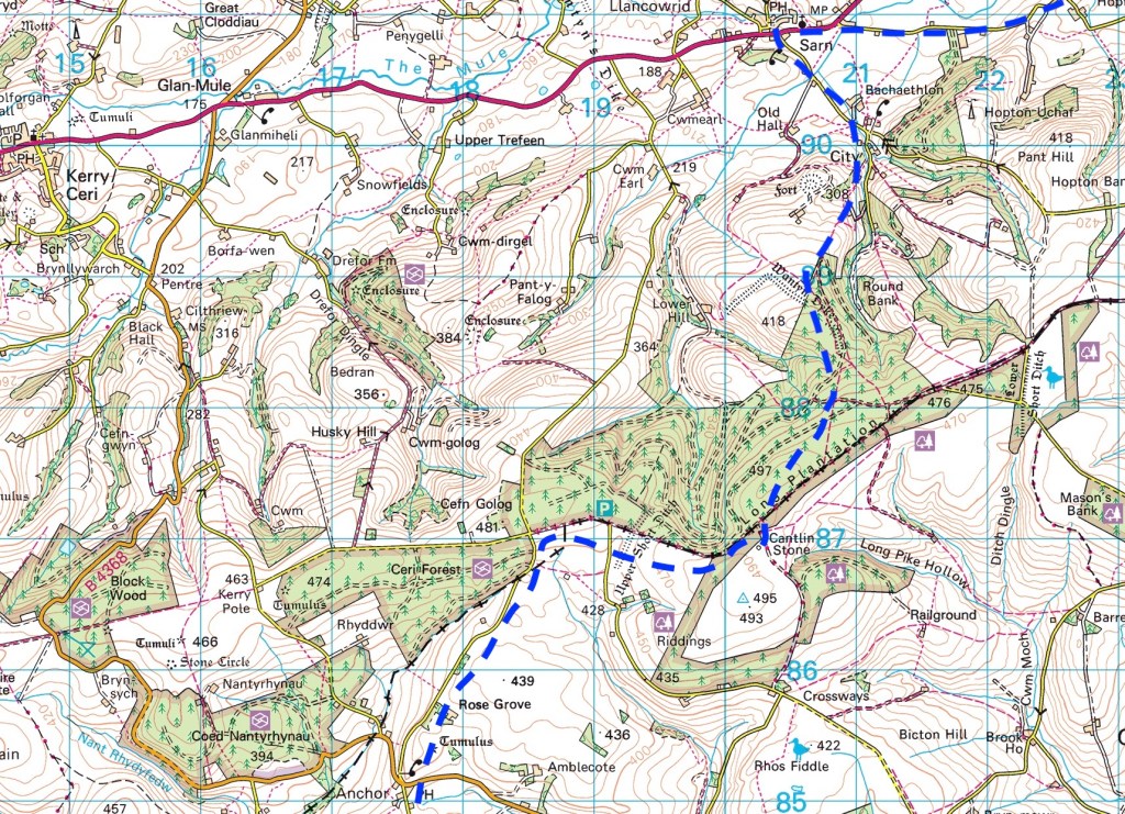 … then, after The Anchor, slightly more north-easterly (Bettws & Sarn parish churches are almost exactly equally positioned to the west.